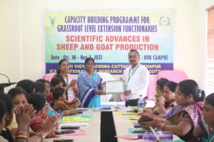 KVK Cuttack organized a five-day capacity building training programme for grassroot level extension workers named ‘pranimitras’ at KVK Cuttack campus, Santhapur during 30.10.2023 to 03.11.2023. Twenty five pranimitras and one official of Odisha Livelihood Mission of Cuttack District participated in this programme. Dr Ranjan Kumar Mohanta, Sr. scientist & Head, the training coordinator, conducted theory and practical classes on sheep and goat production along with answering queries and constraints faced by the trainees in field.
